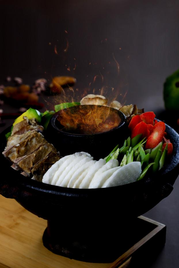 丽江腊排骨火锅选用的是经土法腌制的排骨,再使用云南腾冲纯手工制造的黑土陶锅炖煮,食用时通常搭配时鲜蔬菜:薄荷、韭菜根、西红柿、芹菜、土豆、野生菌、茨菇、粉条等等。以当地特有的蘸水调味,鲜美浓郁,再佐以当地米酒,其滋味不言而喻。