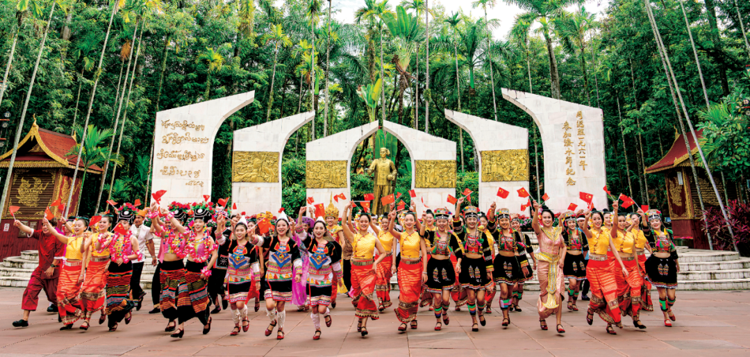 “周总理身穿对襟白褂、咖啡色长裤,头上包着一条水红色头巾,笑容满面地来到人群中。他接过一只象脚鼓,敲着欢乐的鼓点,踩着凤...