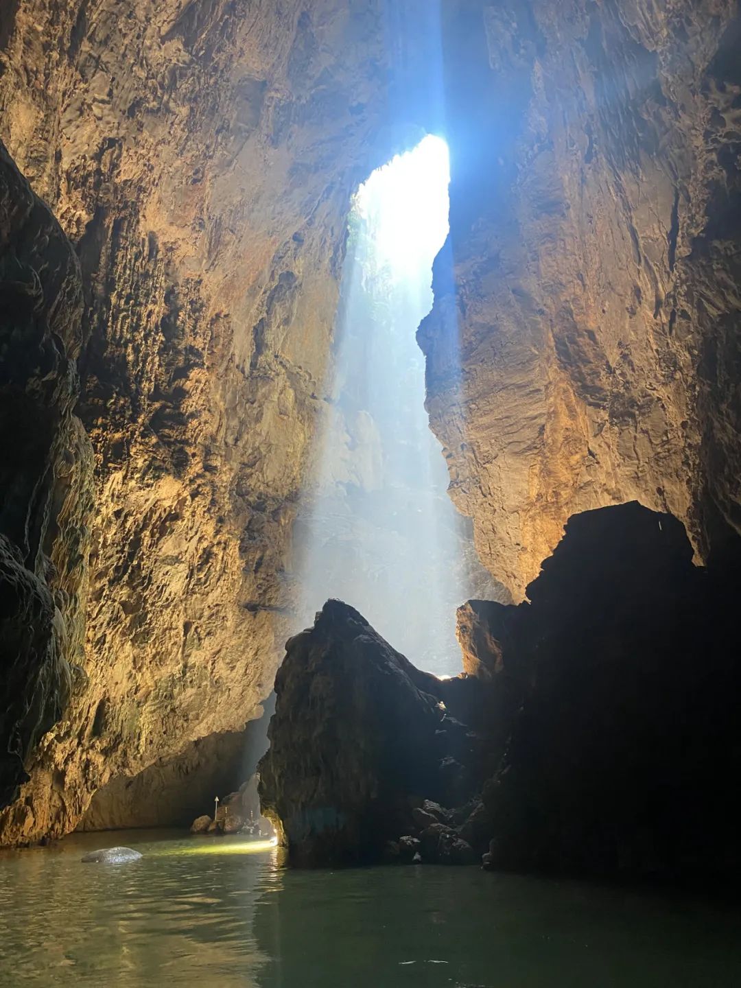 船行洞中,每隔一段时间,高高的洞穹之上便会呈现一个“天洞”,透过天光,洞内景象若隐若现,神秘莫测。在桃源洞的这段水路中,一共要经过三个天窗,它们各具特色。一个天窗前的岩石自然形成了“观音菩萨”的形态,好似大慈大悲的观音菩萨在此以慈悲之光照耀来往的人们。一个天窗前还悬着一颗枝叶婆娑的绿树,窗口之下坐落着一个自然生成的石像,形似雄狮,“雄狮”脚下的河道之中有一块近似椭圆的大石头,这两块石像便被村民们称为“雄狮护宝”。“雄狮护宝”见证了岁月的变迁,它凝聚了千年的守护和忠诚,默默地守护着这片山水的美丽。溶洞时宽时窄,奇岩奇石比比皆是。大概过了十多分钟,湖面上出现了光亮,青山、河流、田地......一切都变得清晰起来,原来豁然开朗就是这般感受。快来坝美世外桃源旅游景区亲身体验《桃花源记》的渔人视角吧!