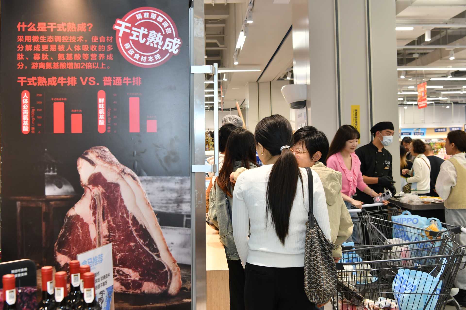 in99盒马鲜生门店面积近3600平方,店内商品丰富,涵盖目前经营的6800种商品。此外,作为西南区域首家旗舰店,还特别引入全球购、熟成牛排、精品红酒等高端商品,为消费者提供丰富的一站式购物体验。