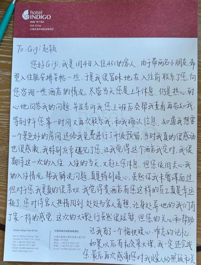 赵颖始终认为,服务的核心在于持之以恒地优化宾客体验。她以客人的认可为前进动力,不断打磨服务细节、创新服务方式,将酒店的邻里文化落到实处。这份平凡岗位上的坚守与奉献,正是新时代国企员工责任与担当的生动诠释,也让大理英迪格酒店的邻里文化在苍洱之间长久传递、温暖延续。