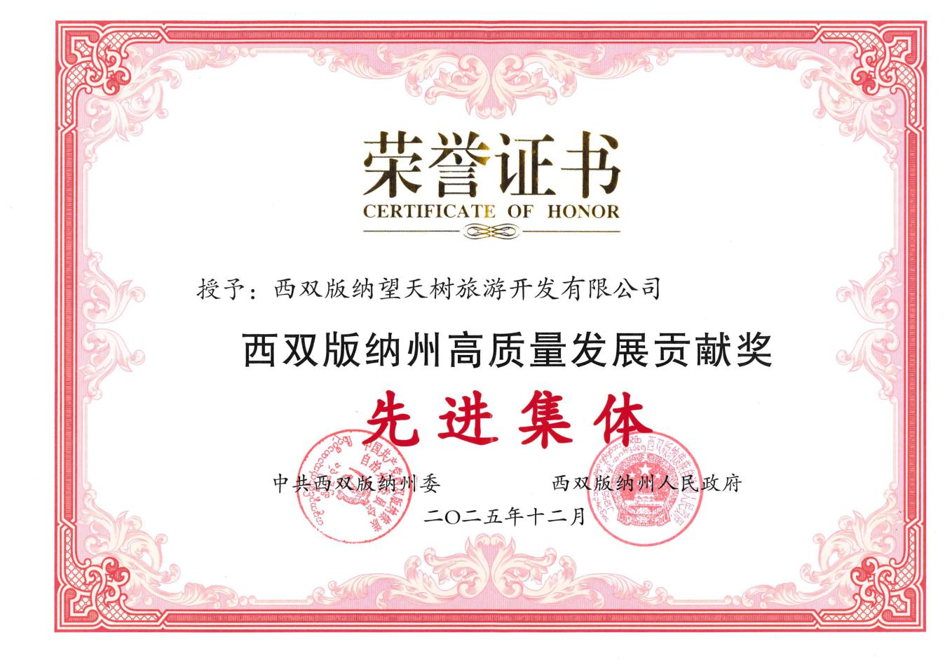 近日,中共西双版纳州委、州人民政府发布表彰决定,西双版纳望天树旅游开发有限公司荣获“西双版纳州高质量发展先进集体”荣誉称号。这一殊荣,是对公司长期以来坚持高质量发展路径、积极服务地方经济社会发展所取得成果的充分肯定。