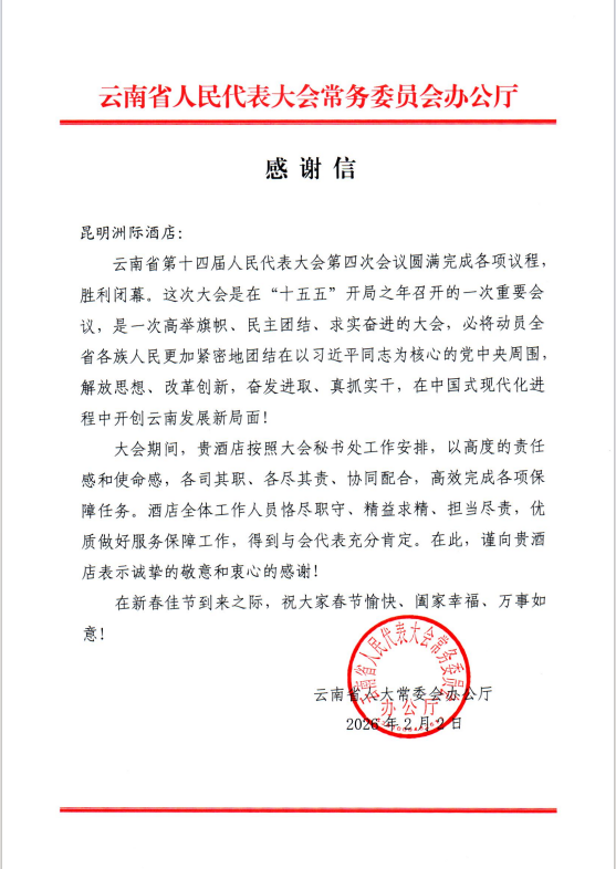 近日,云南省第十四届人民代表大会第四次会议在昆明顺利闭幕。康旅集团旗下昆明洲际酒店作为本次会议的接待保障单位之一,凭借专业的素养与卓越的服务,为会议的顺利召开提供了坚实保障。会议闭幕之际,昆明洲际酒店收到云南省人大常委会办公厅发来的感谢信,对酒店全程高效、贴心、周到的接待服务给予高度评价,对酒店团队的辛勤付出与责任担当表达诚挚谢意。