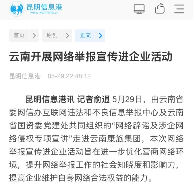 5月29日,由云南省委网信办互联网违法和不良信息举报中心及云南省国资委党建处共同组织的“网络辟谣及涉企网络侵权专项宣讲”走进云南康旅集团,本次网络举报宣传进企业活动旨在进一步优化营商网络环境,提升网络举报工作的社会知晓度和影响力,提高企业维护自身网络合法权益的能力。