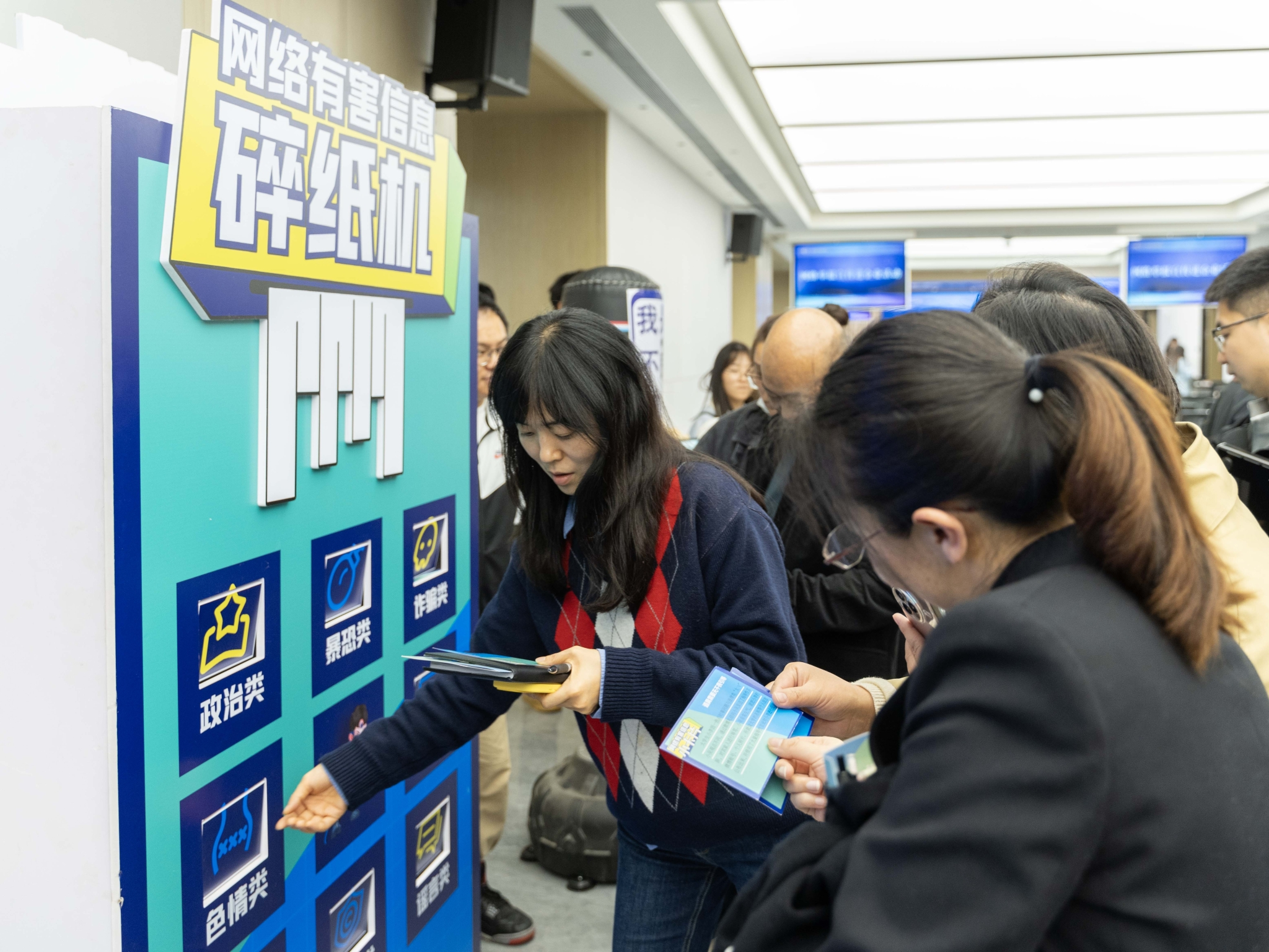 理论宣讲结束后,活动现场设立了趣味互动打卡装置,学员们通过研读卡片内容,对八大类违法和不良信息进行甄别,并将卡片投入对应的举报入口,积极体验互联网违法和不良信息举报流程。
