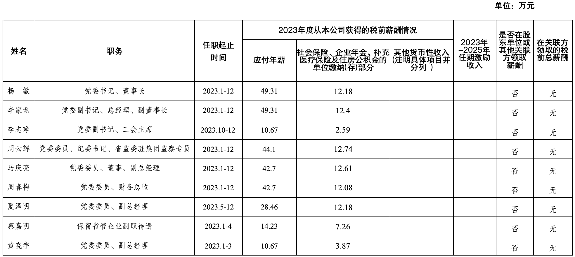 注:1.上表披露薪酬为公司企业负责人报告期内全部应发税前薪酬(不含发放的以往年度绩效年薪)。